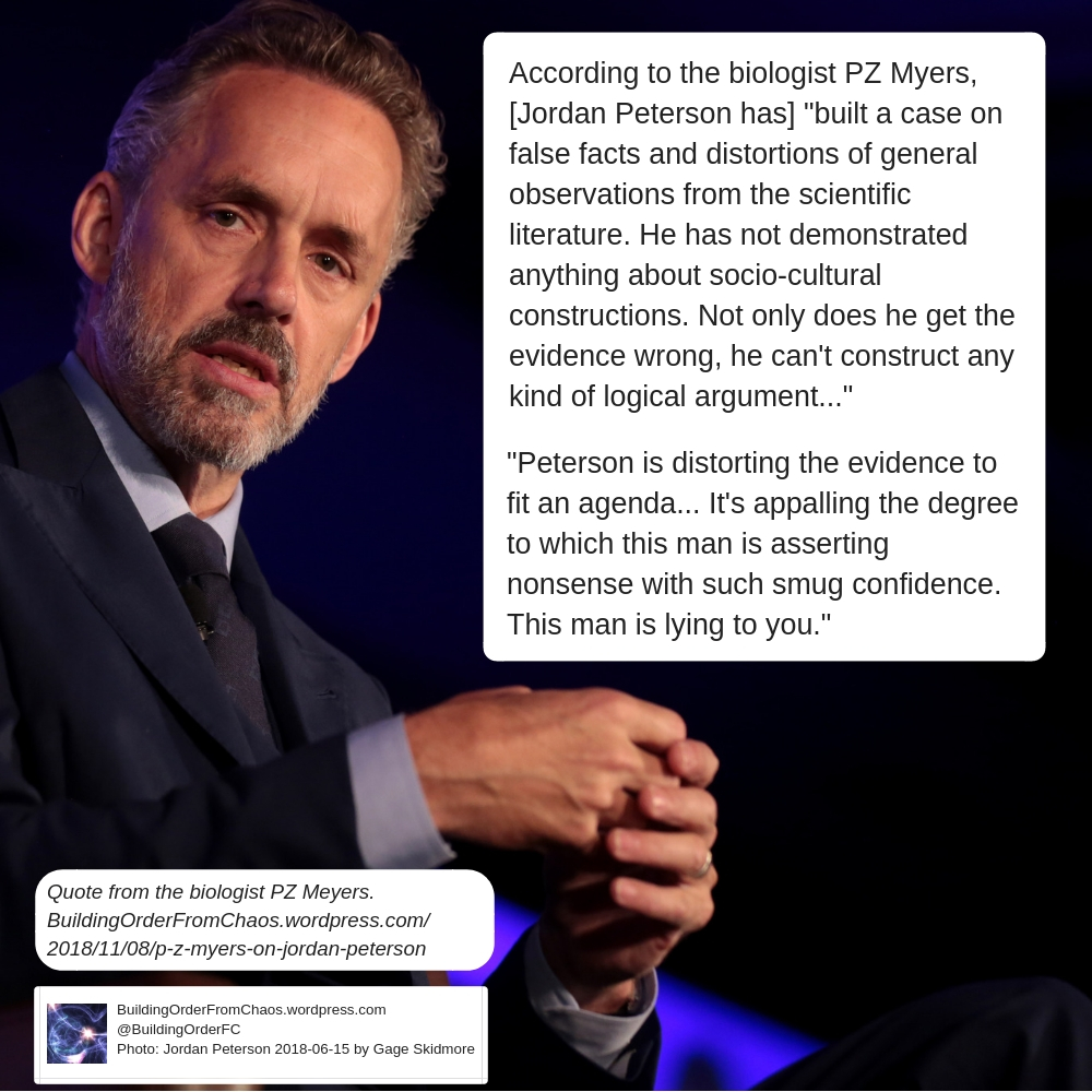 This isn’t the only time Myers has been critical of Peterson. Quoted as part of an article on Peterson in Vice, Myers argues that Peterson has “built a case on false facts and distortions of general observations from the scientific literature. He has not demonstrated anything about socio-cultural constructions. Not only does he get the evidence wrong, he can’t construct any kind of logical argument…”