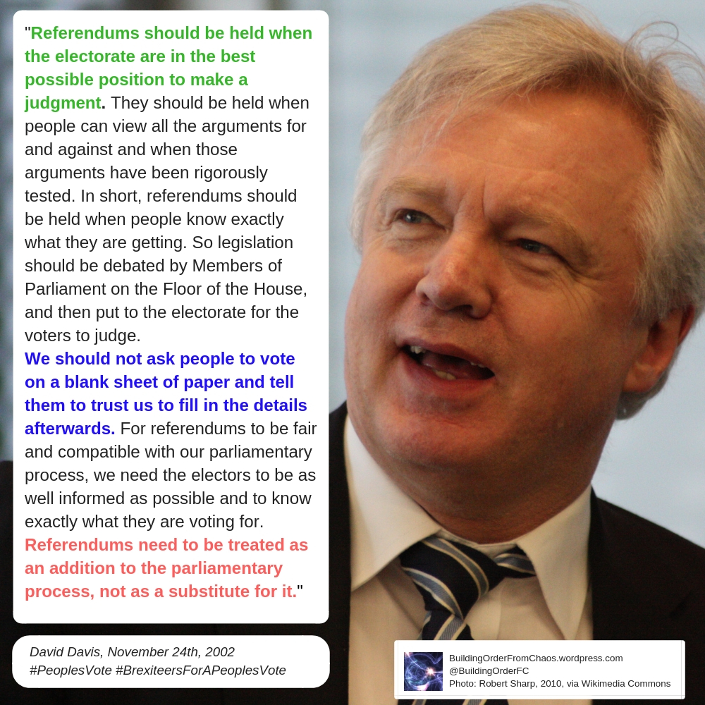 Davis was taking part in a debate on a previous referendum, when the British people were asked to consider ‘Regional Assemblies’ within England. (As a layer of government between councils and the national Parliament, they would have had a range of powers similar to the Welsh and Scottish National Assemblies.) Many of the promises sold by the Leave campaigns were vague or contradictory – very close to the “blank sheet” that 2002 Davis warned against. (Hat tip to Jenny Page, who led me to this relatively obscure quote.)