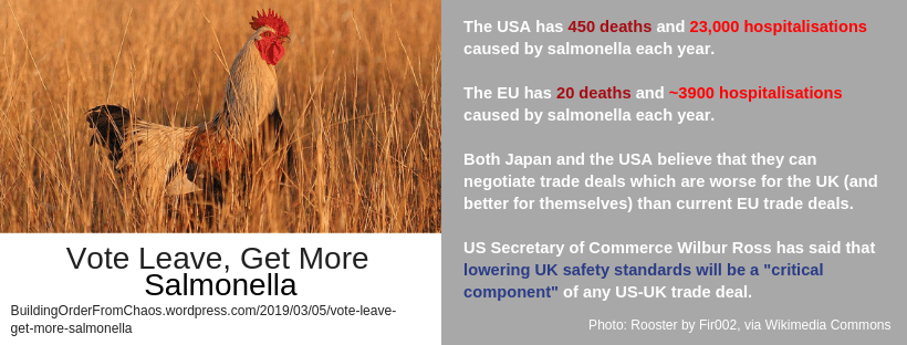 One of the many downsides to Brexit is that it will leave the UK in a weaker position when negotiating trade deals with other countries. According to the Financial Times, Japanese negotiators are demanding more favourable terms from the UK than they agreed to in the recent Japan-EU treaty. American Secretary of Commerce Wilbur Ross has been openly saying for years that accepting lower health standards on food imported from America (such as the infamous ‘chlorinated chicken’) will be a key demand on the American side of a USA-UK trade deal.