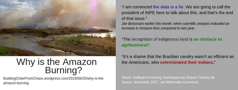 Following the recent publicity around the Amazon fires, Bolsonaro doubled down on the unsupported accusations he made against his environmentalist critics. Not only does he reckon (apparently without evidence) that INPE is faking data, he also reckons that Non-Governmental Organisations are starting forest fires.