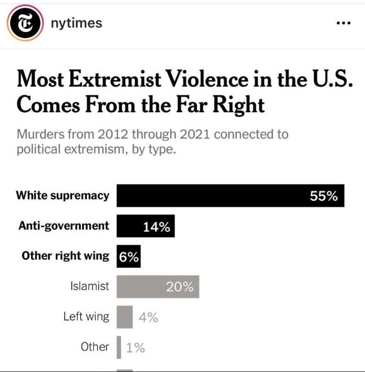The Heritage Foundation – an influential far-right US pressure group – have started pushing the concept of Transgender Ideology-Inspired Violent Extremism or TIIVE, pushing the lie that the 0.1% of transgender mass shooters are somehow an existential threat. The problem with the idea of right-wingers being passive and innocent victims of left-wing terrorism is that it’s more untrue than true. A study by the Anti-Defamation League has concluded that 75% of the 450 political murders between 2012 and 2021 were committed by right-wingers.