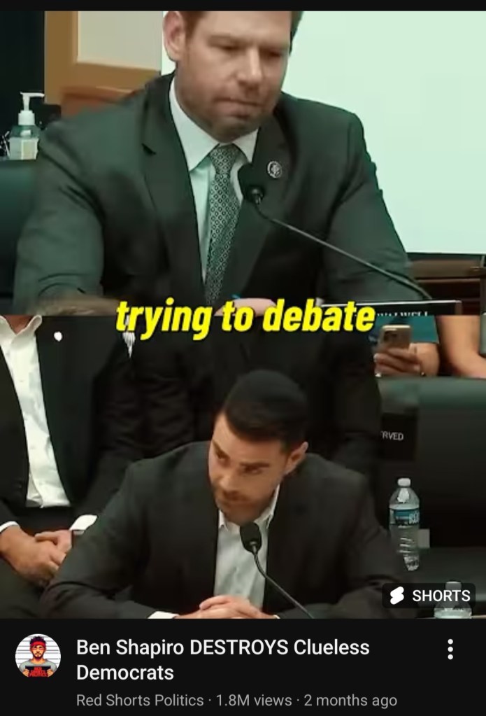 A discussion should follow the process of thesis – antithesis – synthesis. A person enters the conversation with one view on the subject (thesis), listens to the opposing view (antithesis), and after a period of comparing the two, leave with a new, slightly broader perspective that combines the two (synthesis). In a debate, by contrast, the aim is to win. As a result, in a debate understanding any complexity or nuance the other side puts forward is a problem to be avoided, and misrepresentation is a winning strategy. You can see this in the way clips of the personalities’ perceived victories are marketed online, often following a childishly macho formula such as Ben Shapiro DESTROYS blue-haired liberal; Steven Crowder EDUCATES college student; Charlie Kirk MISREPRESENTS nervous teenager.