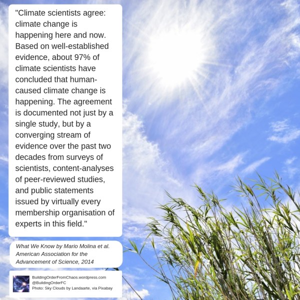 The above quote is taken from a 2014 report commissioned by the American Association for the Advancement of Science, written by Mario Molina et al, entitled What We Know: The Reality, Risks and Response to Climate Change. The quote continues: "Average global temperature has increased by about 1.4° F over the last 100 years. Sea... Continue Reading →